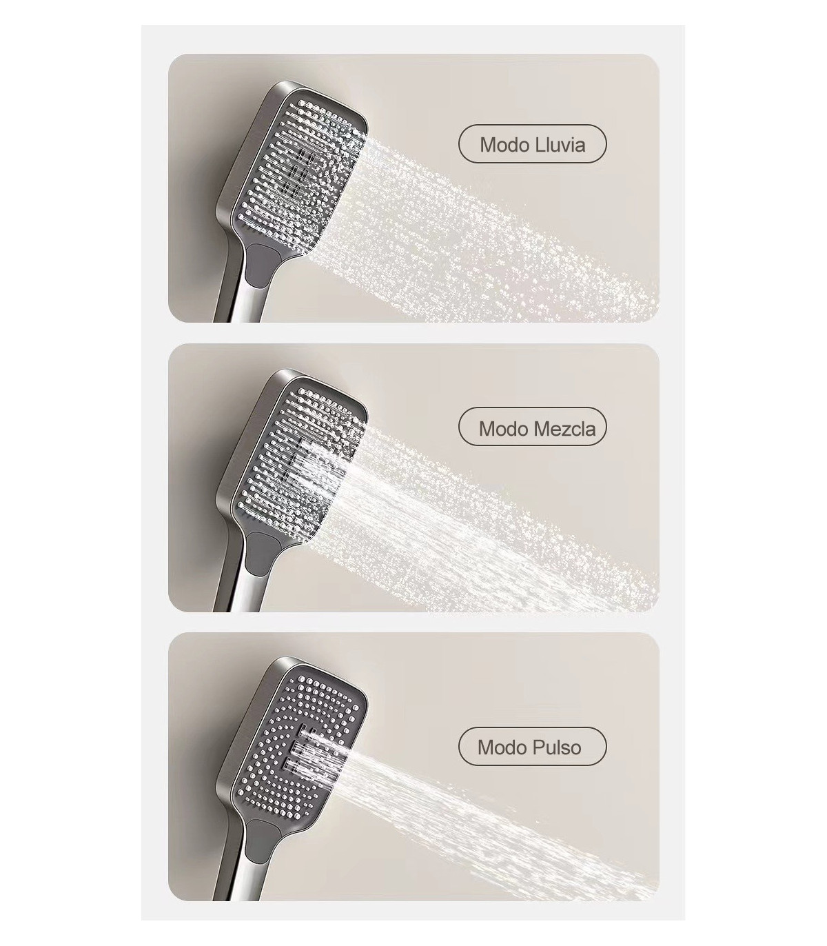 - ROCIADOR DE MANO: Boquillas antical, modos lluvia, mezcla y pulso.