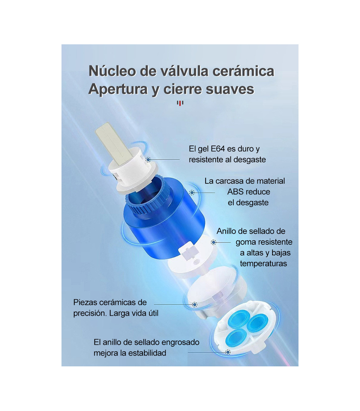 • Núcleo de válvula cerámica. Apertura suave, resisten a las altas temperaturas y a prueba de fugas. Muy resistente al desgaste, duradera.