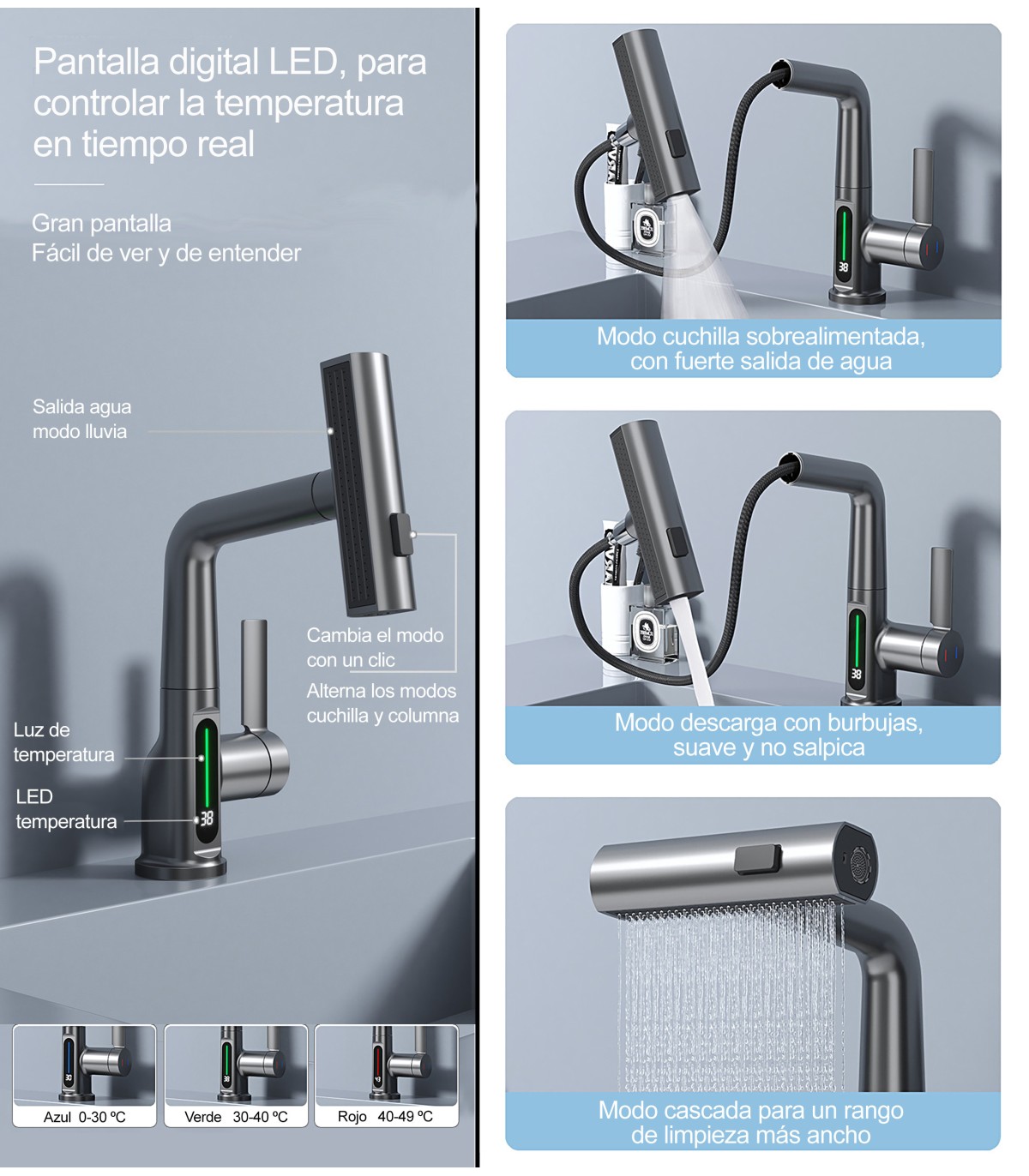 Rubinetto Lavandino Display LED Temperatura LH-189 | Lega | Estraibile 3 modi | Altezza regolabile per Lavare Testa