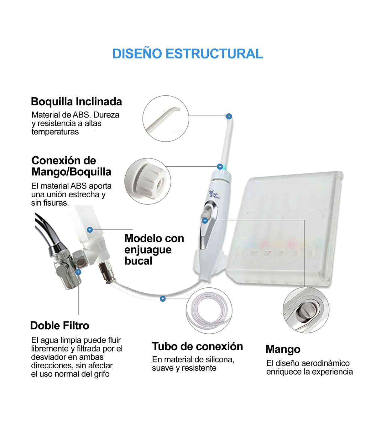 Verwijdert voedselresten effectief met onze irrigator, door gebruik te maken van alle druk van de kraan. Het spuitmondstuk bereikt alle punten in de mond, die met de conventionele tandenstoker moeilijk bereikbaar zijn.