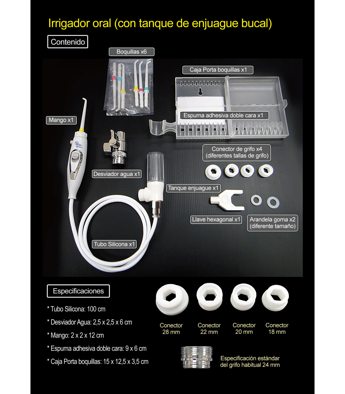 De standaard tandwater irrigator Water No Limits is de meest praktische, stille en effectieve oplossing voor een optimale mondgezondheid, zonder stroom of batterijen. De installatie is heel eenvoudig en past bij wastafels, bidets, spoelbakken of douches. Sluit hem gewoon aan op de kraan, activeer de afsluiter en hij is klaar voor gebruik met alle druk van het leidingwater.