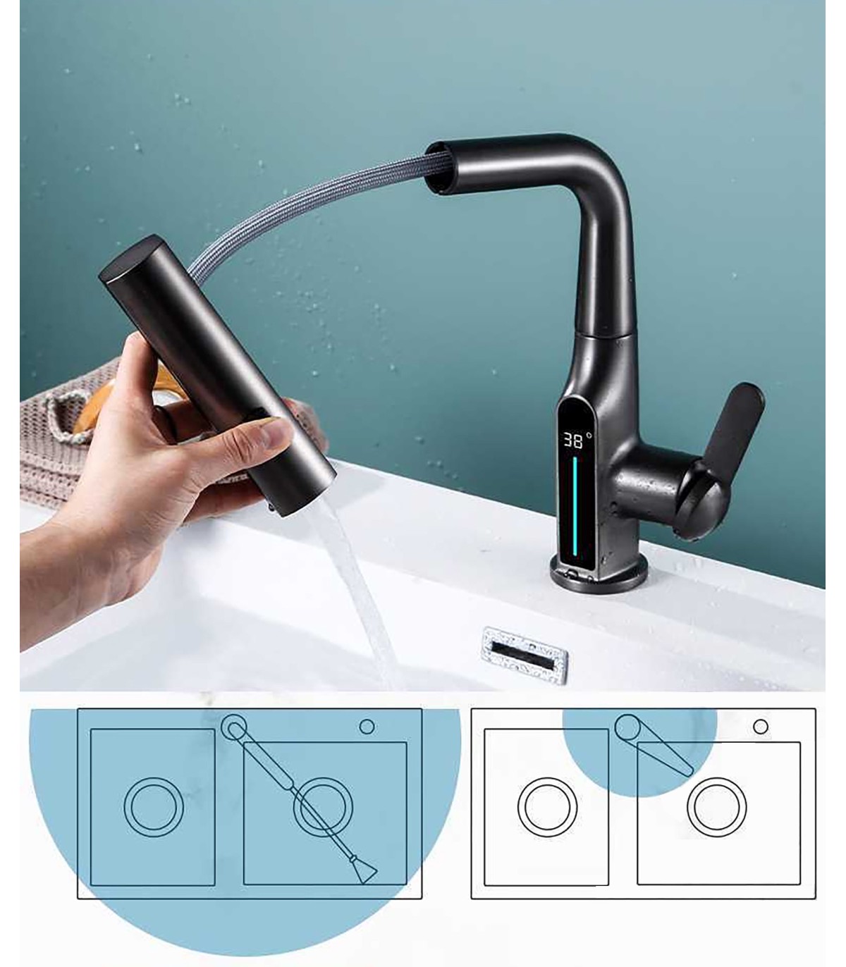 Wastafelkraan Temperatuurdisplay LH-189 | Legeer | Uittrekbare 3 modi | Hoogte instelbaar voor Hoofdwassen