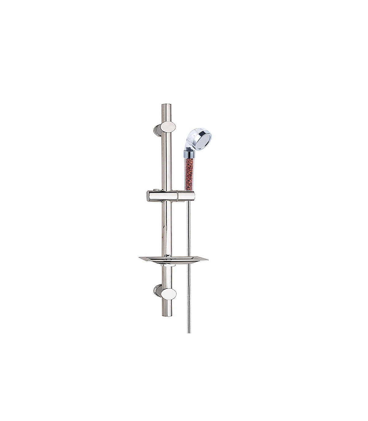 Komplett dusjsett bestående av justerbar stang med integrert ablageflate, 1,5 m enkryptert dusjrør og overfødt dusjdyse med minerale kuler for generering av negative ioner. Designet for å forbedre dusjopplevelsen, øke vanntrykk og optimalisere vannkvalitet.