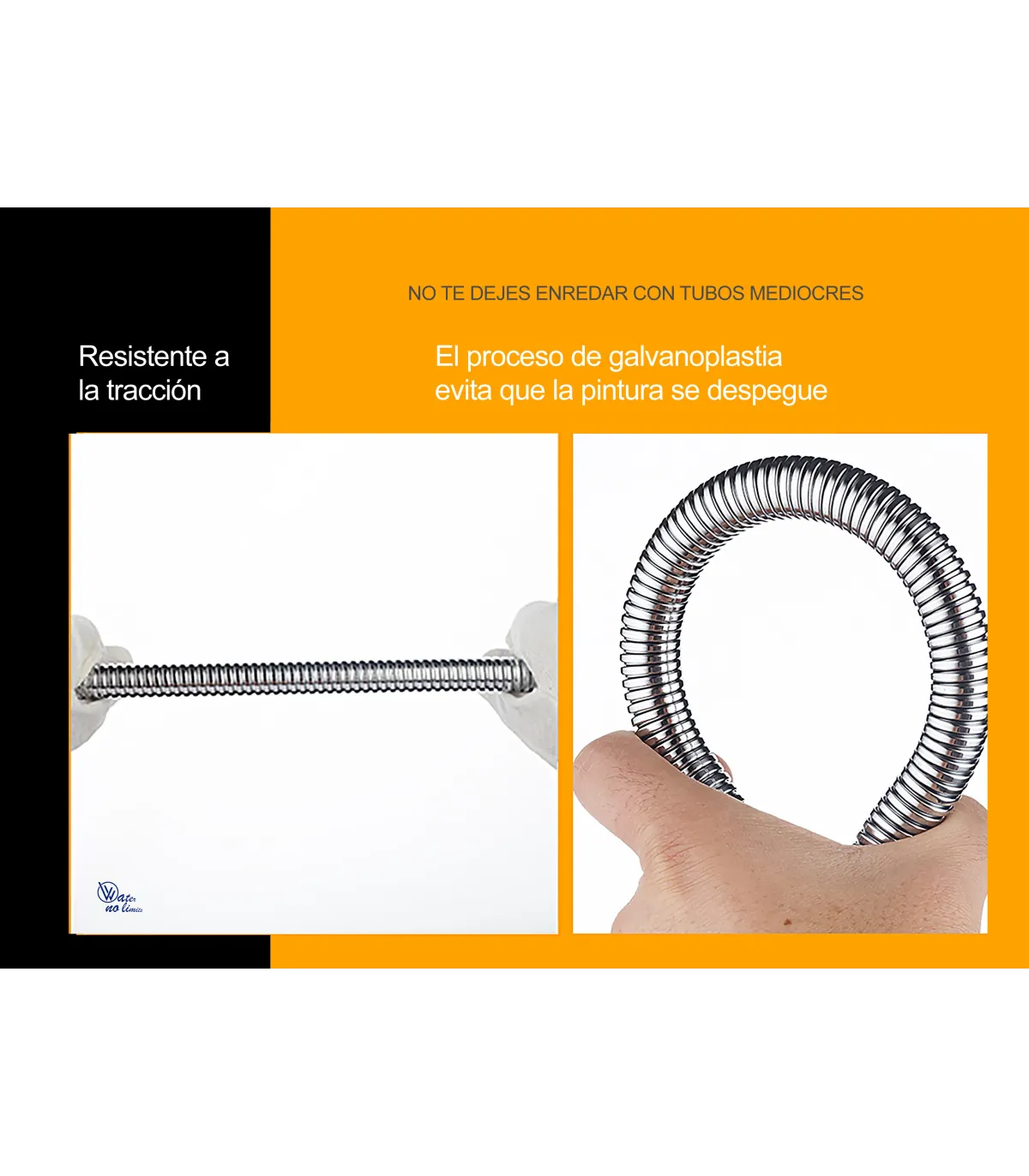 O revestimento exterior e feito em aco inox com fivela dupla (70-75 g/m²) e tratamento de galvanizacao. Este revestimento protege a mangueira interior, melhora a resistencia a traccao e torsao e evita que se enrede ou se deteriore com o uso.