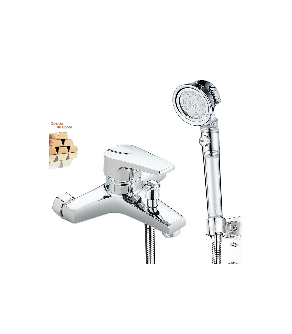 - Pack Completo de Coluna de Duche-Banheira: Inclui torneira monocomando, cabezal pressurizado, suporte de parede, 2 filtros e tubo de aço inox de 1,5m.