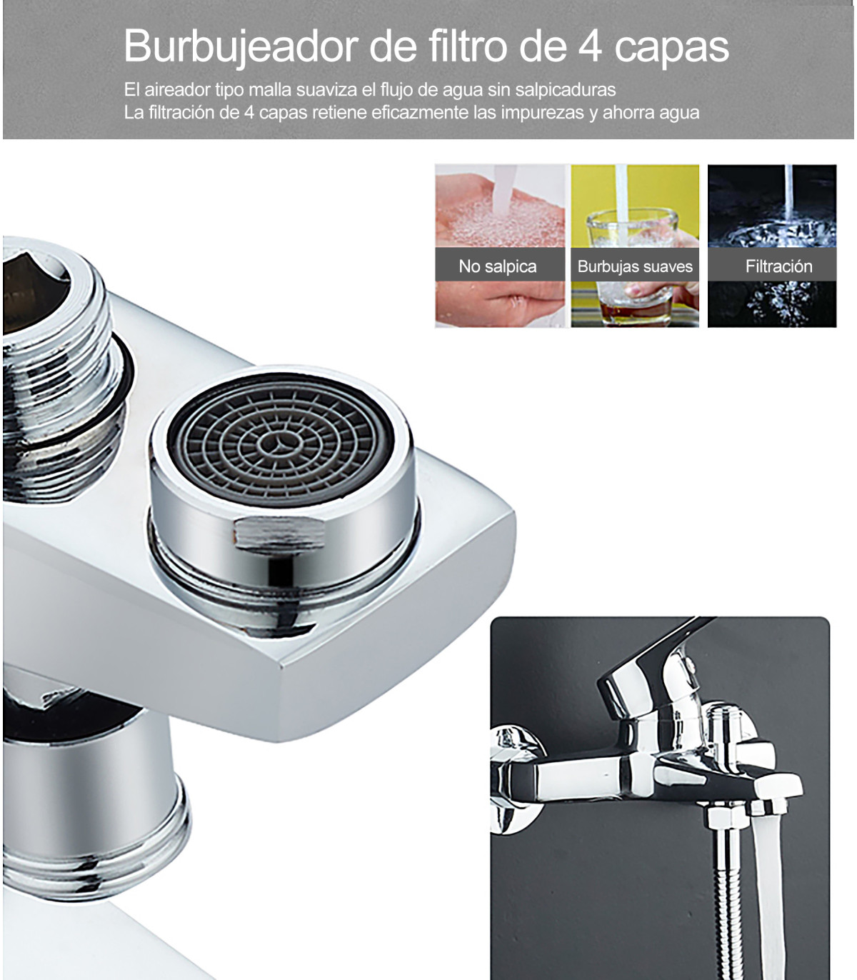 - Torneira Monocomando Banheira-Duche: Feita de cobre refinado antibacteriano, antifúngico, núcleo cerâmico, arejador de malha e desviador para função banho.