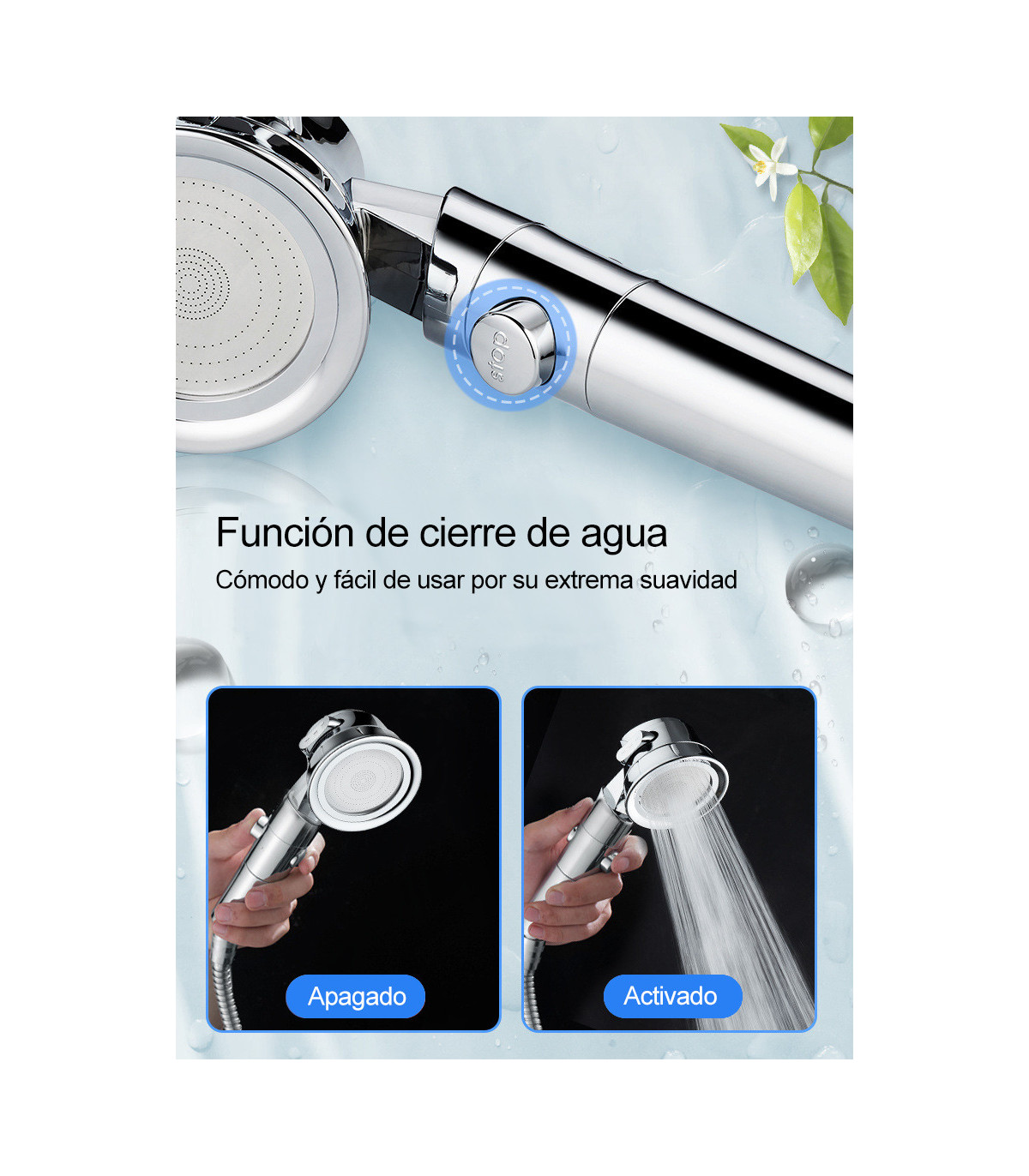 - Cabezal Superior Pressurizado Sobre Alimentado: Três modos (Pulso, Spray Montanha, Chuva), cabezal inclinável e filtro transparente para controlo de água.